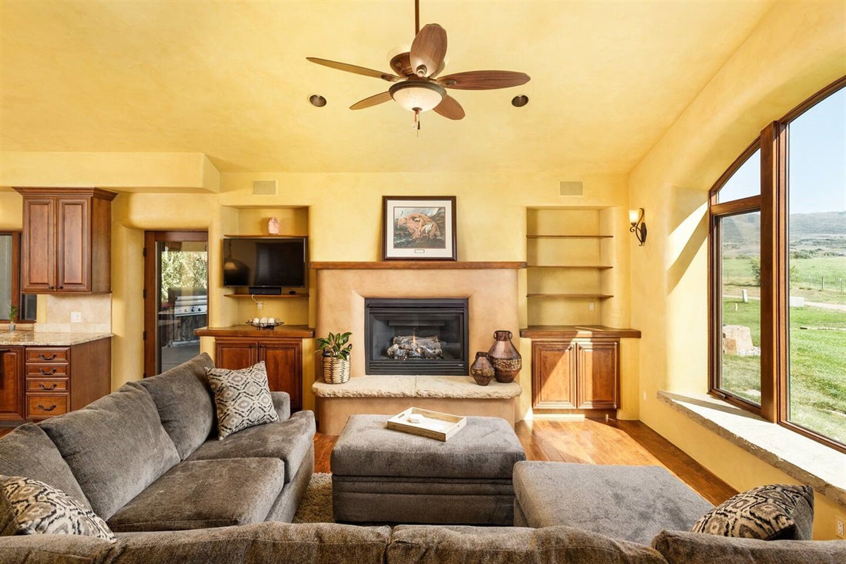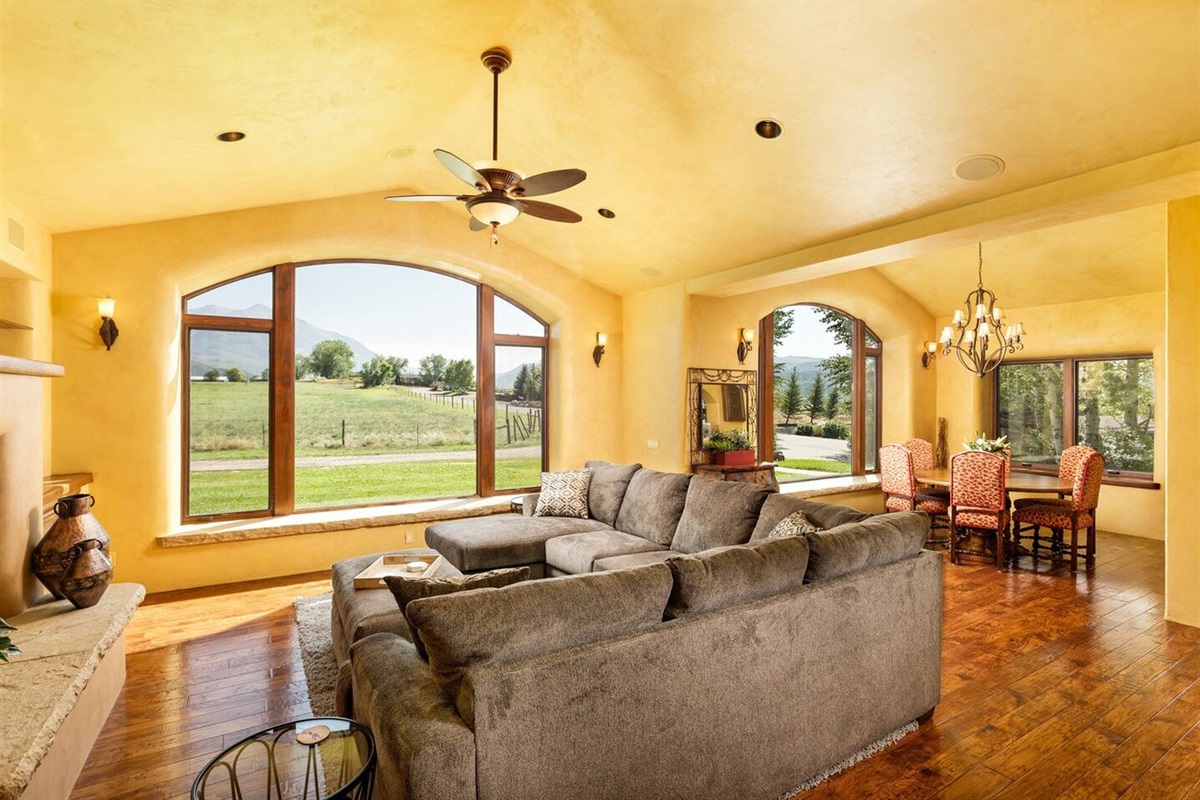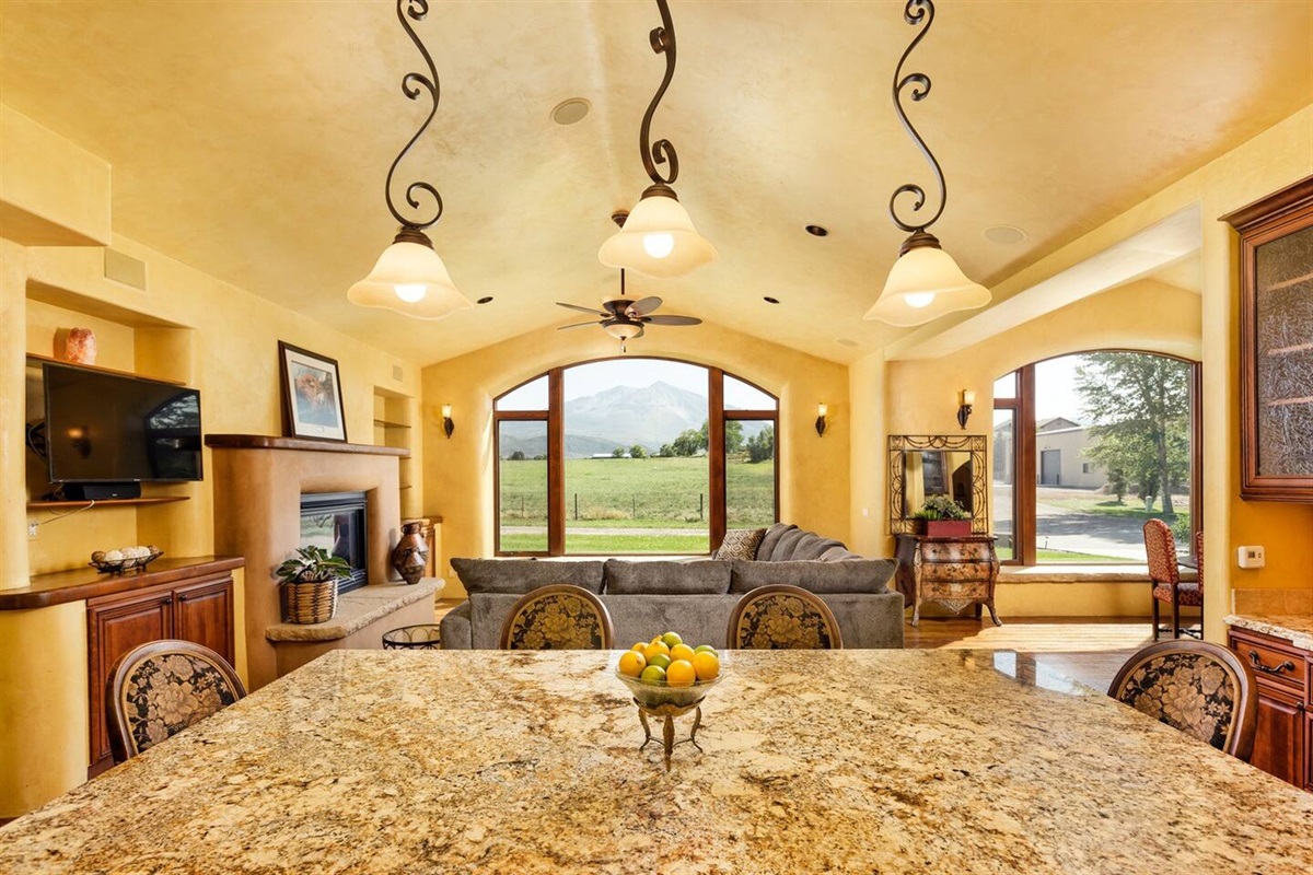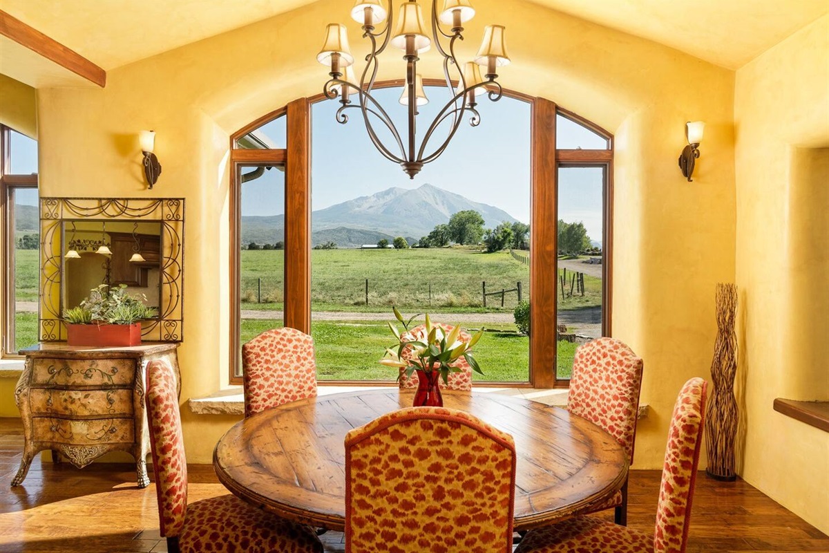 Enter your panoramic retreat and move through the home to notice thick, earth-tone walls that surround you as you gaze out one of many stunning picture windows spread throughout the home. As you walk through the front entryway across gorgeous stained concrete floors that turn into warm wood, you are lead into the open-concept living room, dining room, and kitchen. Your culinary delight awaits in the spacious kitchen with large wood-paneled fridge, six-burner stove, and eat-at counter/bar. As you cook, cast your eyes upwards towards a stunning view of the pasture leading to Mount Sopris from across the living room. Serve up your feast in the inviting dining room with a stunning picture window to bless your meal.