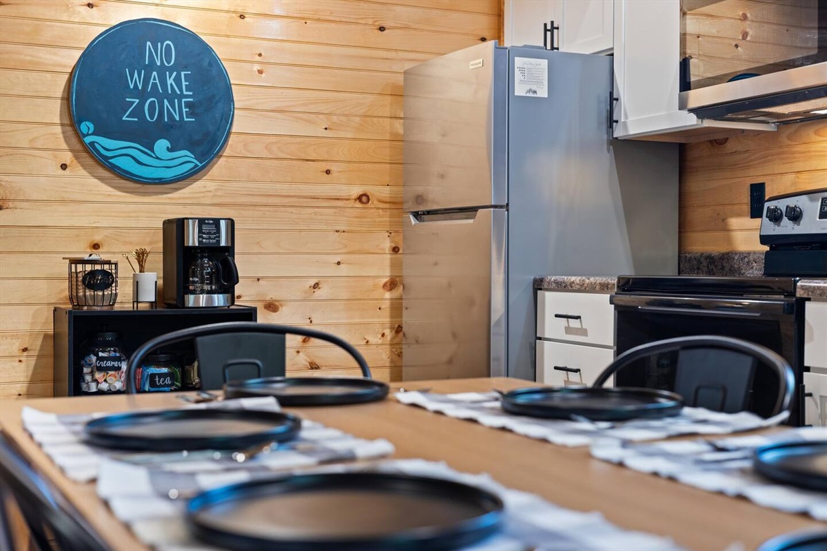 - Fully stocked coffee bar: Drip Coffee Maker, Coffee Grounds, creamer, sugar