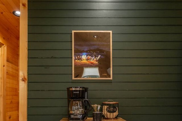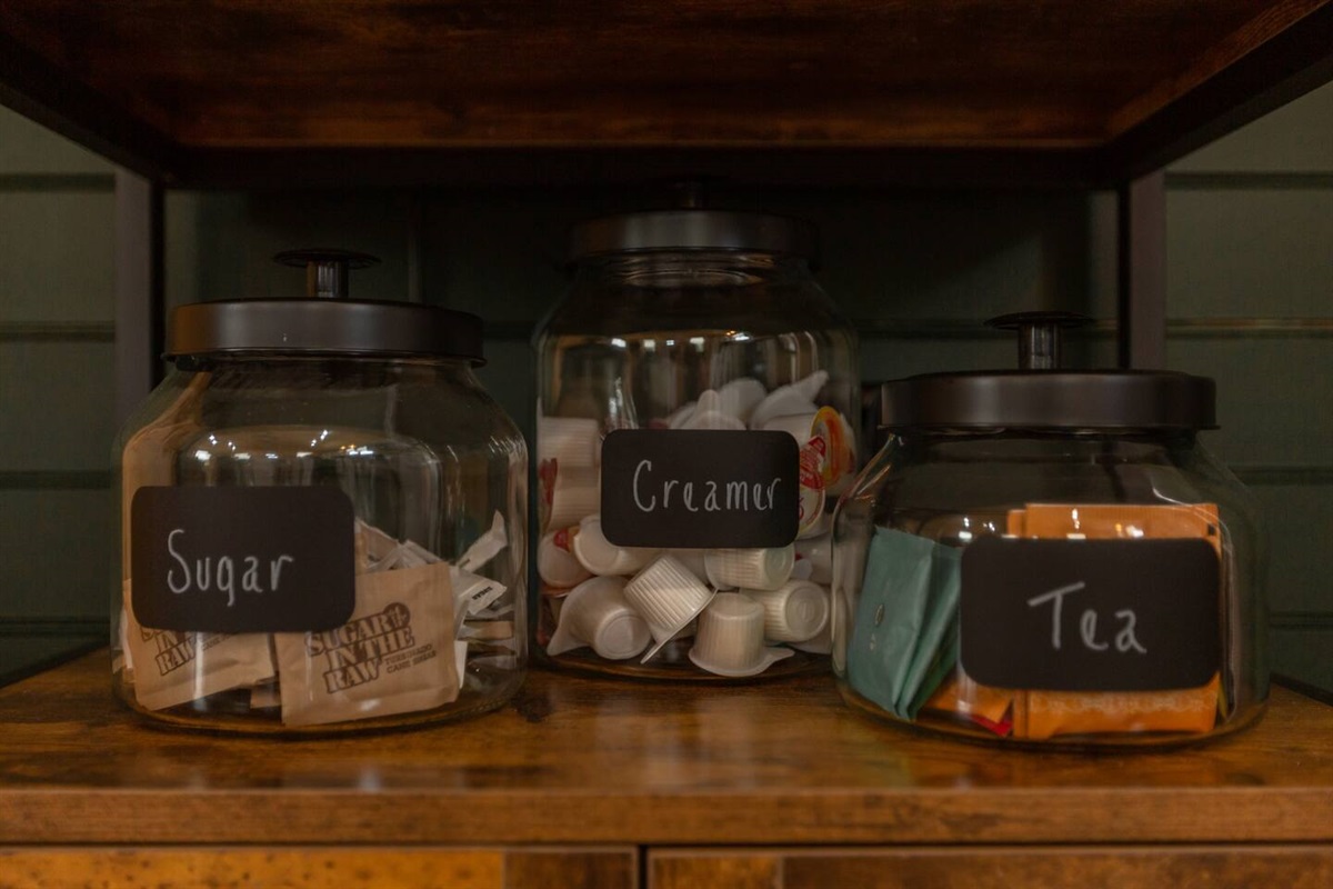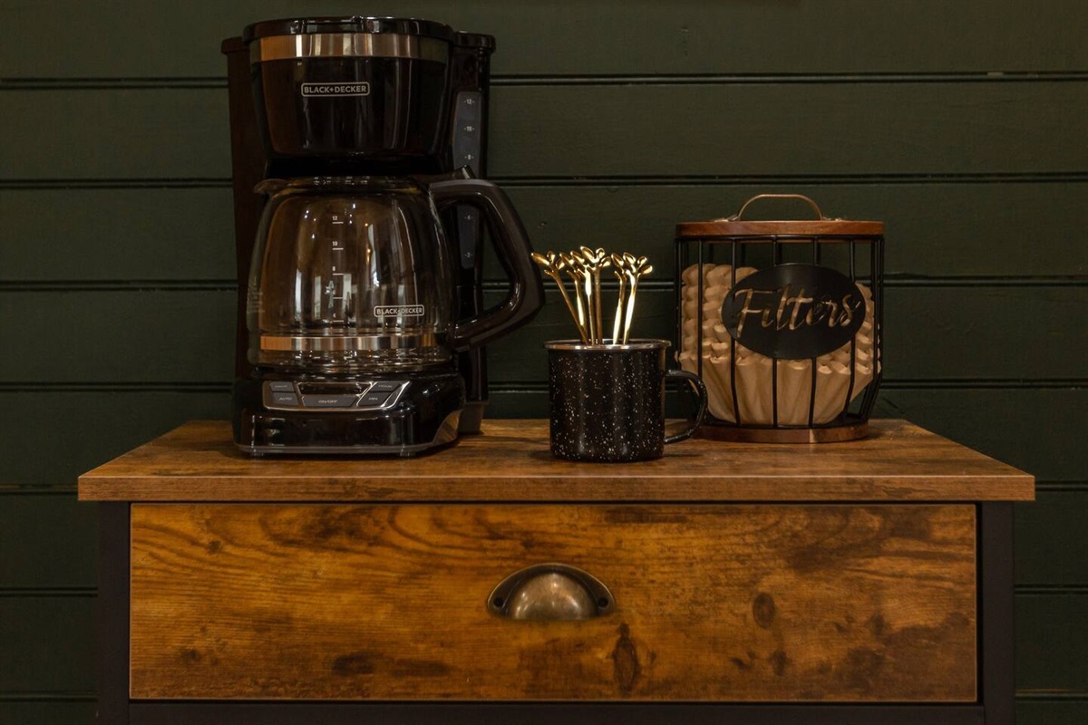 - Fully stocked coffee bar: Drip Coffee Maker, Coffee Grounds, creamer, sugar