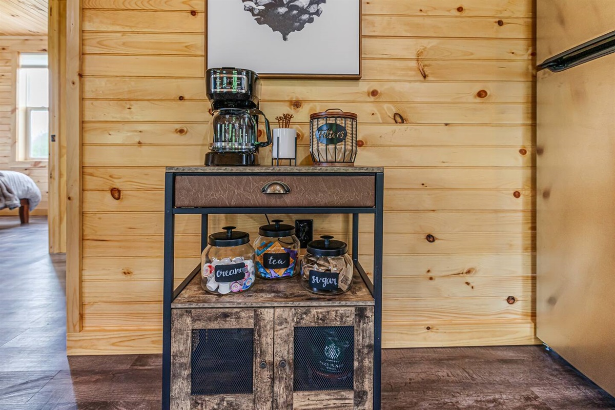 - Fully stocked coffee bar: Drip coffee maker, Coffee Grounds, creamer, sugar